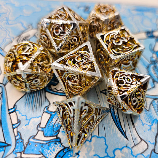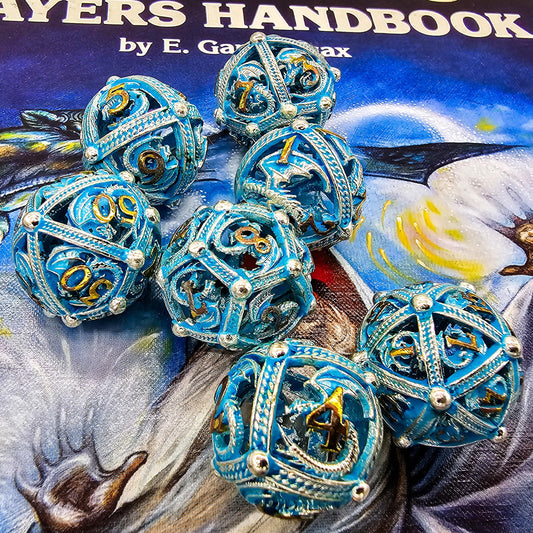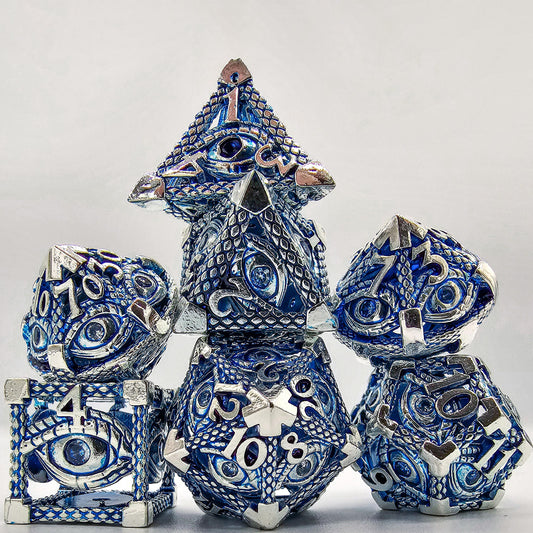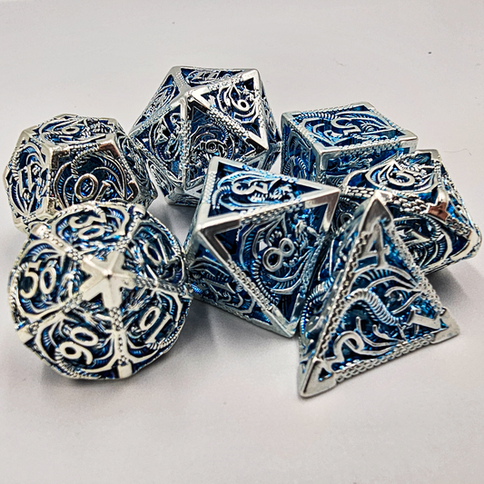 Hollow Metal Blue & Silver Dragon DND Dice Set