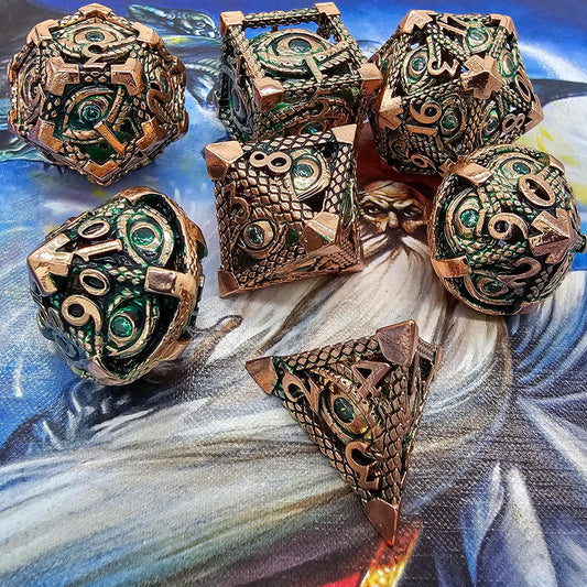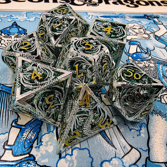 Hollow Metal Green Silver & Gold Dragon DND Dice Set