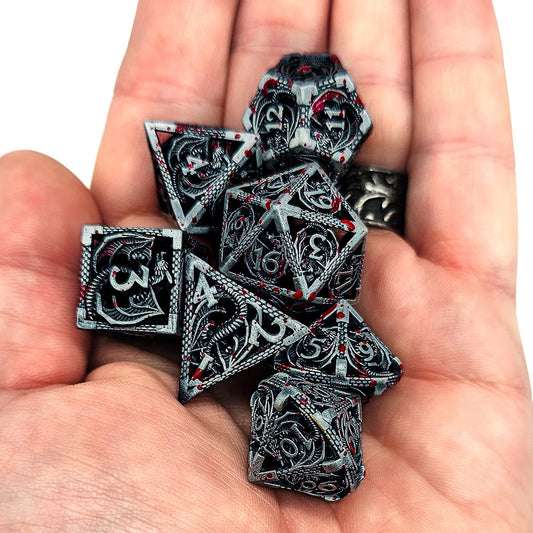 Hollow Metal Grey Blood Splatter Dragon DND Dice Set