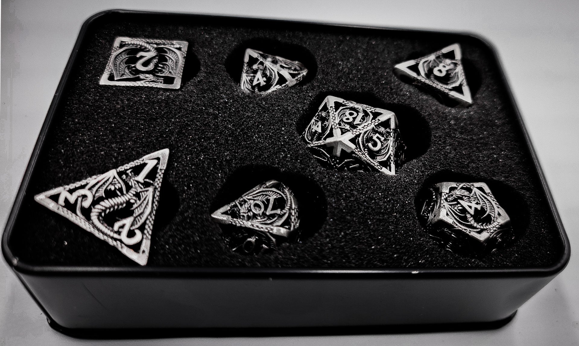 Hollow Metal Grey Dragon DND Dice Set